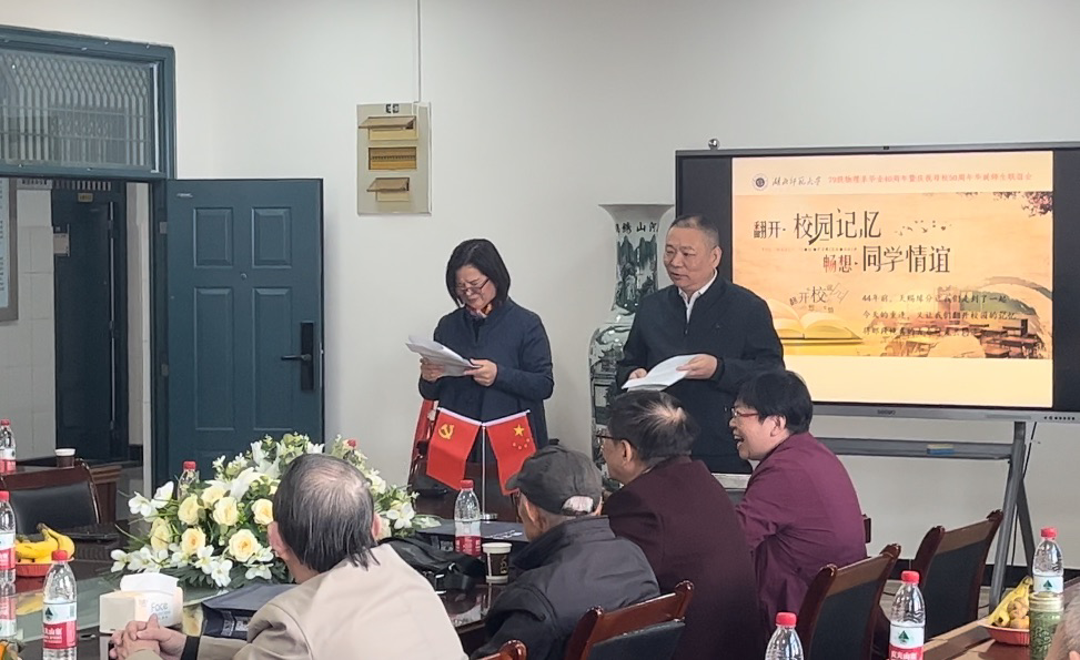 下午79级座谈会由校友乐红勇、肖红英主持。会前,79级物理系校友播放了毕业40周年暨庆祝母校50周年华诞的视频。孙丹娟、刘美风向校友们表示热烈的欢迎,向莅临座谈会的老教师们致以崇高的敬意。他们表示,学院全体师生一定会倍加努力,竭尽全力把学院建设好、发展好,这既是校友们对母校的期许,也是学院实现跨越式发展的需要。