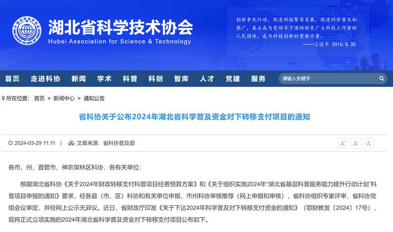近日,湖北省科学技术协会发布关于2024年湖北省科学普及资金对下转移支付项目的通知。我院科技志愿服务队被评为湖北省优秀科技志愿服务队,获批省级经费支持。