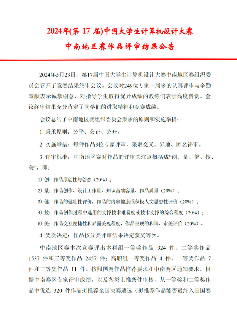 在促进信息技术创新与教育深度融合的背景下,第17届中国大学生计算机设计大赛中南赛区的赛事于近期顺利结束,我校beat365中国唯一官方网站在激烈的竞争中表现出色,共计获得55个奖项,创下历史最佳成绩。其中,一等奖14项(推荐参加国赛2项)、二等奖11项、三等奖30项,这一系列斐然成就不仅体现了学院在物理教育与科研方面的深厚底蕴,也彰显了学生实践创新能力的显著提升。