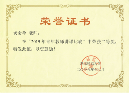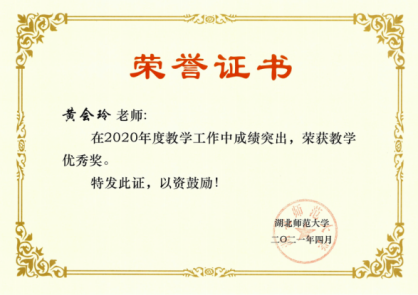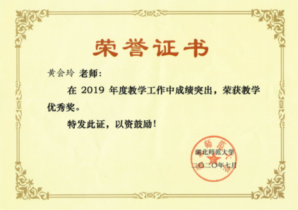 黄会玲老师自2002年进入yl23411集团官网,成为一名老师。从教22年来,她一直手捧一颗赤诚的爱心,为人师表,率先垂范,切实履行职责,努力提高教学科研水平,教学效果好,受到学生喜爱,连续7年获得教学优秀,2024年被评yl23411集团官网优秀教师。