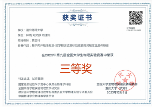 在注重基础知识教学的同时,黄会玲老师还重视学生综合素质的提升。依据学生主体的学习基础、年龄特点、心理特点,科学合理地综合利用各种方法,进一步激发学生的学习兴趣、研究兴趣和创新意识,提高学生学习的主动性和有效性。在课余时间积极指导学生开展科研活动,提高学生的创新能力与实际动手能力。近5年来,黄老师指导学生在全国大学生物理实验竞赛、中国大学生计算机设计大赛等比赛中获得国家级、省级奖项近10项。