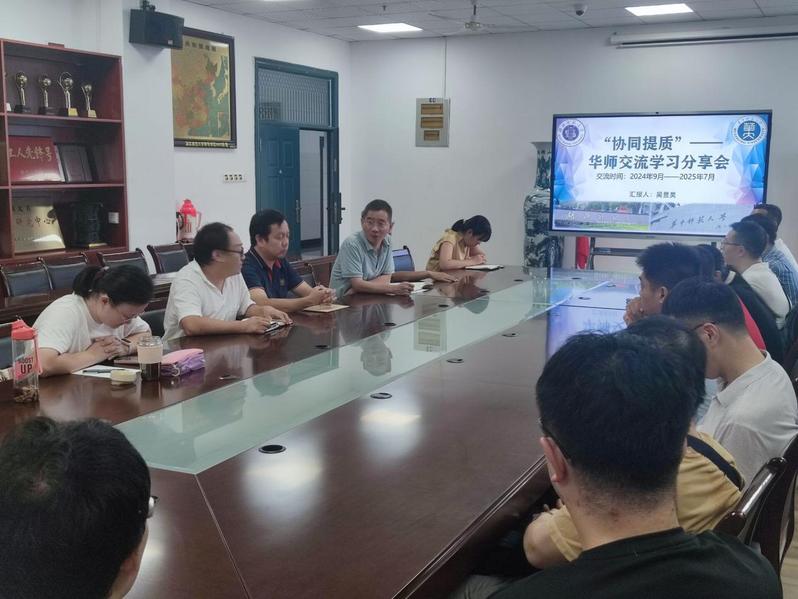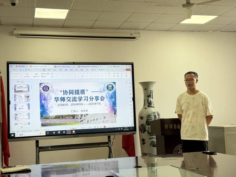 202594下午三点我院物理学系在信息大楼10508会议室召开了“协同提质”——华师交流学习分享会,会议邀请物理专业2202班吴昱昊同学分享在华中师范大学学习交流一年来的经历和体会会议由物理学系主任李海超主持,科研副院长单传家和物理学专业教师参会