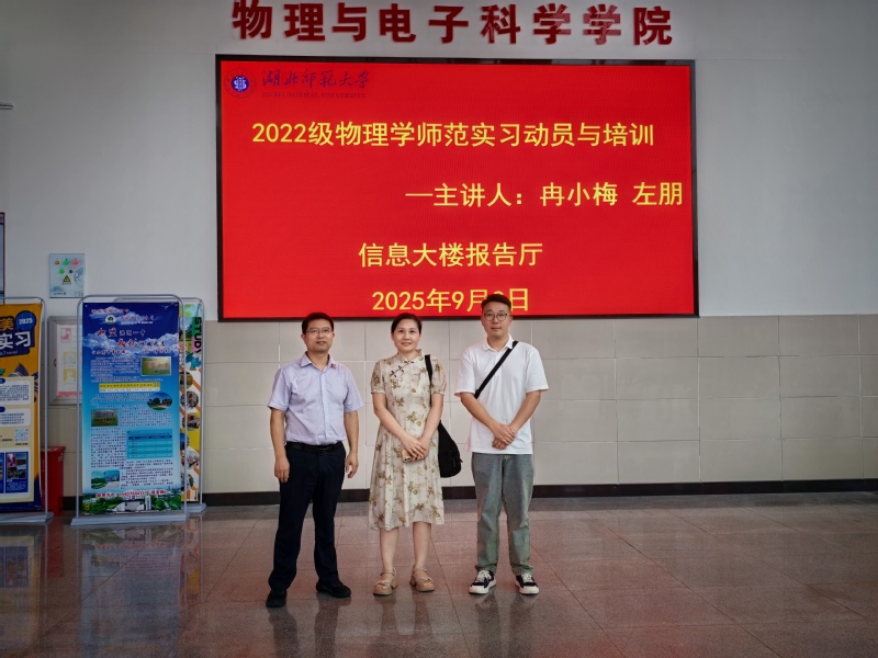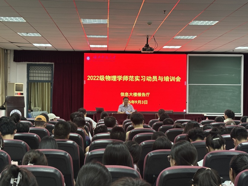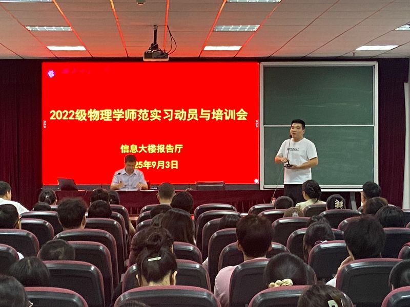 为贯彻落实我校关于教育实习的工作精神,提升我院2026届物理学师范专业学生教育实习工作质量,yl23411集团官网于2025年9月3日晚18:30在信息大楼报告厅召开了我院2026届师范生教育实习动员大会暨培训活动。本次活动特邀黄石十五中冉小梅、左朋2位优秀教师分享一线教学经验,yl23411集团官网副院长田开坤主持培训会,物理学系主任李海超、中教法教研室教师、辅导员田学泽和2026届物理学师范专业学生参会。
